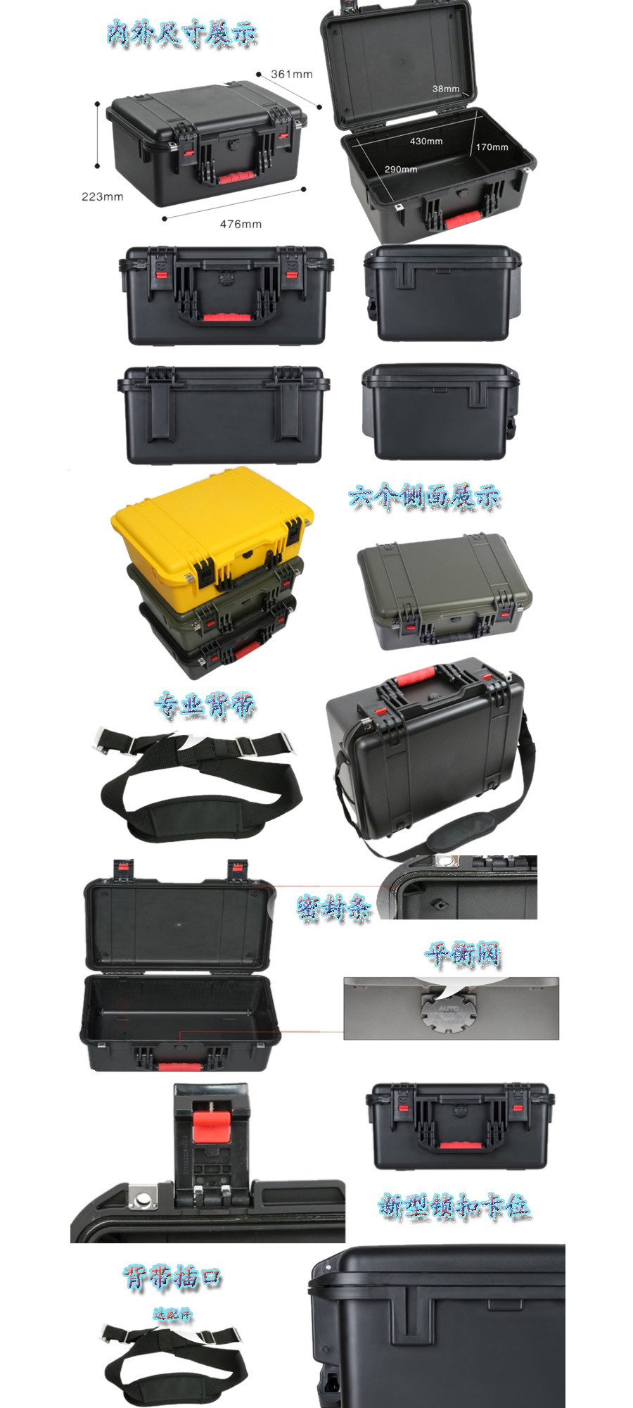 簡要說明:廣泛用于傳媒、公安、消防、軍隊、航空、戶外攝影、野外考察、科學(xué)探測等眾多領(lǐng)域的高端儀器、儀表。具有高強度、高抗壓沖擊、防潮、絕對密封、防塵、防水等特點。產(chǎn)品材質(zhì):ABS原料,箱體采用高抗沖擊的高分子聚合材料一體注塑成型,密封采用扁型彈性發(fā)泡密封橡膠條,確保防水氣密,所有較軸均采用不銹鋼材質(zhì)。