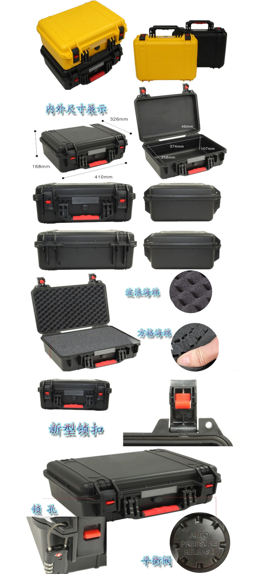 簡要說明:廣泛用于傳媒、公安、消防、軍隊、航空、戶外攝影、野外考察、科學(xué)探測等眾多領(lǐng)域的高端儀器、儀表。具有高強度、高抗壓沖擊、防潮、絕對密封、防塵、防水等特點。產(chǎn)品材質(zhì):ABS原料,箱體采用高抗沖擊的高分子聚合材料一體注塑成型,密封采用扁型彈性發(fā)泡密封橡膠條,確保防水氣密,所有較軸均采用不銹鋼材質(zhì)。